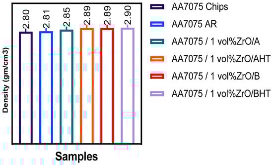 The full factorial conducted for density test (Figure 12) shows the density of the samples. The RSM analysis indicated that the density increased along all the parameters used in sample extrusion. The maximum density (2.89 g/cm3) was attained at 450 °C, 3 h, and 5% for T, t, and VF, respectively; for the ECAP sample, the maximum density (2.89 g/cm3) was attained at 550 °Ċ, 1.58 h, and 1% for T, t, and VF and 2.9 g/cm3 after heat treatment, indicating that high temperature and dense compaction of the chips resulted in poor inter-chip consolidation [17]. These extrusion conditions were only suitable for eliminating the voids and were incapable of improving the chip bonding. Although samples extruded at high temperatures had higher strength [18], such conditions resulted in lower density due to the formation of residual voids and cracks in the extruded products. In general, the preheating temperature along with preheating time and volume fraction of ZrO2 were relatively more crucial for determining the density in the hot extrusion of the solid-state recycling method.