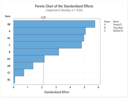 The coefficient of determination for density, the value of R2, R2-adjusted, and R2-predicted are 98.24%, 96.83%, and 93.22%, respectively. The value of R2 indicates that only about 1% of the total variation was not explained by the model. This implies that the regression model provides an excellent explanation of the relationship between the independent variables and the response.