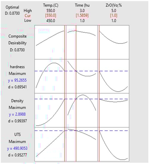 The multi-objective optimisation results of this study were consistent with the above optimal results, especially with T and VF. The maximum responses of this study for T, t, and VF were 550 °C, 1.6 h, and 1 vol% ZrO2. The average UTS, microhardness, and density of this study were 490 MPa, 95.2 HV, and 2.89 g/cm3, respectively (Figure 14).