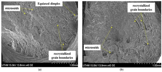 Surface fracture of the ZrO2 nanoparticles and the damage mechanism for the AA7075 extruded sample (Figure 15a), and the microstructure of the reinforced samples with ZrO2 nanoparticles (Figure 15b) with a uniform distribution of particles in the MMC are shown. The ceramic phase was dark, and the white one was the metal matrix of AA7075. The distribution of the composite was dependent on the good interfacial bonding between ZrO2 nanoparticles and the matrix along the grain boundaries that redacted the equiaxed dimples. However, microvoids were visible in some regions.