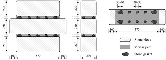 The stone blocks (kind of coarse granite material, collected from the historical unreinforced buildings of stone structure) were stacked with the support of stone gaskets before filling in with the mortar (Figure 4). The mortar was mixed and poured in the laboratory; then, it was filled evenly into the gap between the stone blocks. We pressed properly to ensure the density of mortar. After the completion of the mortar joint masonry, water spray curing was conducted on the surface of the mortar joint for 7 days, following a natural curing time of 28 days before the experiment. In addition, the upper and lower ends of the specimen are leveled with concrete for installation.