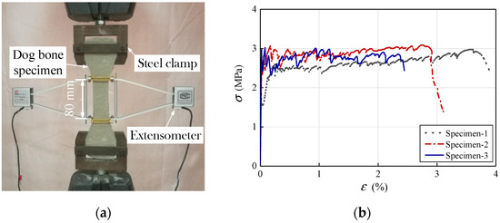 (a) Tensile tests on ECC dog bone-shaped specimens; (b) Tensile stress–strain curves of ECC specimens.