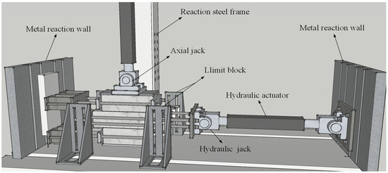 The specimens were tested under displacement-controlled cyclic loading using a 500 kN servo-controlled hydraulic actuator with a stroke length of ±100 mm, as shown in Figure 6. The upper and lower stone blocks were fixed on a metal reaction wall through four screws with steel plates on each side, avoiding moving with the horizontal load. Four limit blocks with a roller were applied to limit the anti-plane displacement of specimens.