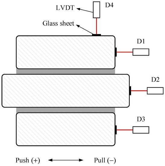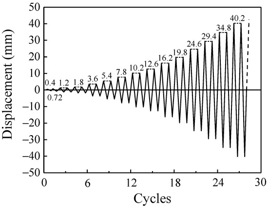 The specimens were loaded in two stages: elastic stage and plastic stage following the recommendations of JGJ/T101 [27] and ISO 16670 [28], until the mortar joint attained significant damage or failure (the vertical displacement of the specimen exceeds 40% of the mortar joint’s thickness). Each load cycle was applied only once in the elastic stage of the specimen. Two repeated cycles for each displacement level were applied in the second stage until the specimens were severely damaged. The specific loading protocol is shown in Figure 7.