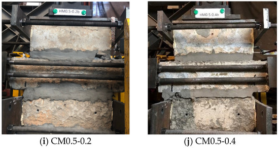 For the case of composite mortar specimens, as the ECC on both sides of the mortar joint protected the mortar in the middle, these specimens could also show prominent integrity as well as good performance. Early experimental phenomena were similar to that of ECC specimens (Figure 12a) until reaching the peak load (Figure 12b). For the CM0.3 specimens, minor shear cracks were initiated first on the surface of ordinary mortar in the middle, which was followed by ECC being gradually squeezed out due to the expansion of mortar inside (Figure 12c), and then, the tests were terminated (Figure 12d). In CM0.5 specimens, a higher proportion of ECC formed stronger confinement to the mortar in the middle. As a result, the whole composite mortar joint remained complete without ECC peeling off.
