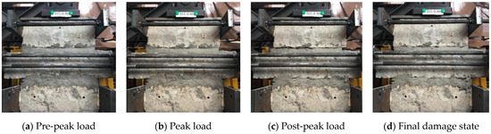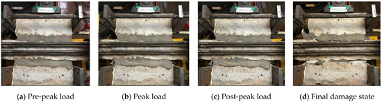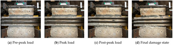 Typical failure process of M/PM specimens (PM-0.4): (a) Pre-peak load, (b) Peak load, (c) Post-peak load and (d) Final damage state.