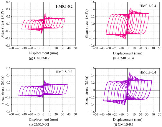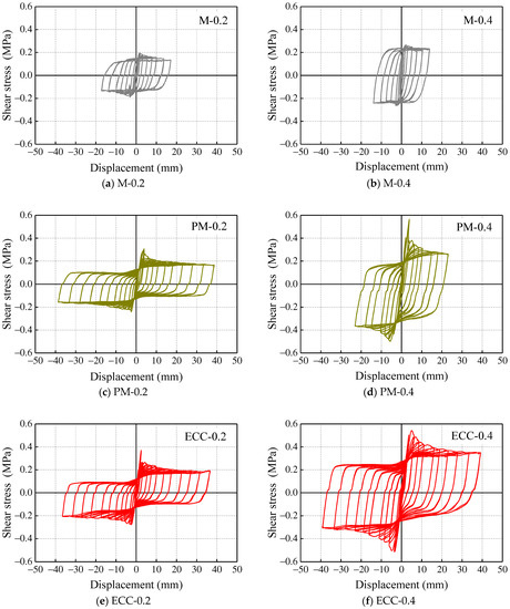 Figure 14 shows the comparisons of the shear stress–displacement response of specimens. It was observed that specimens using ECC showed higher deformation ability, and an increase in the axial compressive stress increased the load-carrying capacity of the specimens. In the initial stage of the test, the skeleton curves of all kinds of mortar joints maintained linear growth, with the elastic modulus values very close to each other. ECC specimens saw the highest value of shear strength in all the specimens for 0.2 MPa axial compressive stress. As for high axial compressive stress (0.4 MPa), PM-0.4 and ECC-0.4 had a similar shear strength, while the degradation in strength in the ECC specimen was more gradual than that of the PM specimen (Figure 14b).