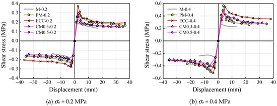 Shear stress–displacement responses: (a) σn = 0.2 MPa and (b) σn = 0.4 MPa.