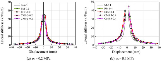Figure 15 shows the secant stiffness of the specimens at different displacement levels. The initial lateral stiffness of all the specimens increased with an increase in axial compressive stress. This may be due to the higher axial compressive stress leading to a higher frictional force between the stone blocks and mortar joint, which improves the lateral resistance of specimens. As seen in Figure 15a, all the specimens tended to present adjacent trends as well as similar initial stiffness around 35 kN/mm under the axial compressive stress of 0.2 MPa. For the case of the specimens under 0.4 MPa compressive stress, specimen M-0.4 exhibited a rapid stiffness degradation due to the low compressive strength of mortar. The application of ECC in composite mortar had significantly increased the lateral secant stiffness of specimens, while the degradation in strength was more gradual.