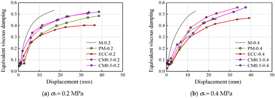 Equivalent viscous damping: (a) σn = 0.2 MPa and (b) σn = 0.4 MPa.