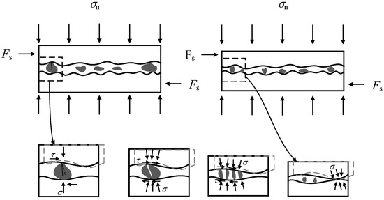 In this stage, the interface bond is completely invalid and replaced by friction-sliding behavior. For specimens M-0.2, M-0.4, PM-0.4, and CM0.3-0.4, the mortar in the joint is destroyed and squeezed out, and the stone blocks on both sides of the mortar joint come into contact. Mechanical occlusion as well as friction slip occurred simultaneously in these specimens (Figure 20). For the case of other specimens without obvious mortar spalling, the sliding friction between the stone block and mortar joints is the main component of shear strength of specimens. In other words, the mortar joints have already quitted the work regardless of whether the mortar is peeling or not.