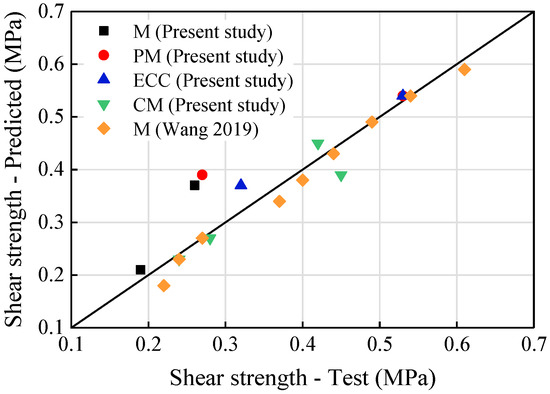 Comparison of the shear strength between the predicted results and the test data.