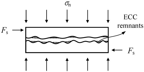 Considering the potential change of surface roughness degree during the loading process, especially in stage Ⅳ, the geometric friction angle (ϕ) may have changed at the same time. For the case of ECC specimens, after the formation of horizontal joint cracks, the peeled ECC in the ECC–stone block interface remains bonded to the stone and fills the indentation of it. As a result, the regularity level of stone blocks tend to decrease to some degree (Figure 22). When assuming the geometric friction angle drops from 7.9 degrees to 0, then the internal friction coefficients for mortar and ECC are 0.578 and 0.795, respectively. The residual shear strengths considering geometric friction angle as 0 (τp,r0) are calculated in Table 6. Owing to the mechanical occlusion behavior in ordinary mortar joint during stage Ⅳ (see Figure 20), the geometric friction angle in these specimens sees a higher value than that of ECC specimens. Therefore, combined with the results in Table 6, direct calculation by Equation (6) with deduction of cohesive force is suggested, while a reduction factor of 0.83 (the reciprocal of the average of τp,r/τe,r) for ECC ones is proposed when predicting the residual shear strength of mortar joints.