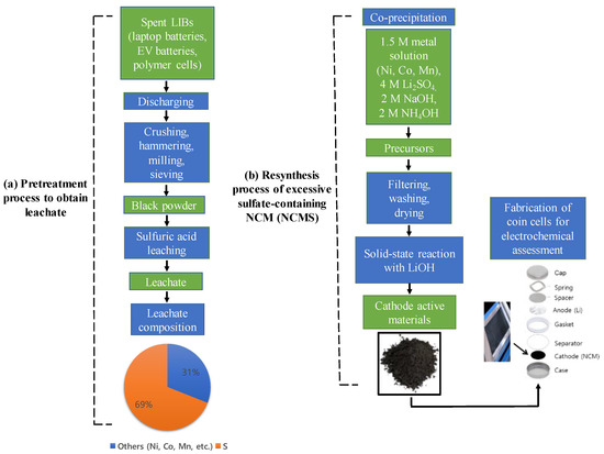 Flowchart of methodology for the resynthesis of excessive sulfate-containing NCM from spent LIBs. (a) Typical pretreatment process of spent LIBs with subsequent acidic leaching process using H2SO4, indicating the excessive sulfur content in leachate. (b) Synthesis process of sulfate-containing NCMS(OH)2 precursors using the co-precipitation method and NCMS cathode active materials via a solid-state reaction, followed by a fabrication of coin cells for electrochemical assessment.