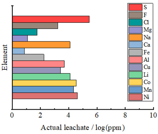 Figure 2 shows the content of various elements in the actual LIB leachate from a LIB recycling company (SungEel HiTech, Gunsan-si, Korea). Li, Ni, Mn, and Co are detected as major constituents of cathode materials and other metal elements, including Al, Cu, and Na, originate from current collectors and the pretreatments for LIB recycling [18,19,20]. Notably, nonmetal elements, including F, Cl, and S, are detected in the LIB leachate. Each element was analyzed by the following methods: Inductively coupled plasma for metal elements, absorptiometric analysis using La alizarin complexone for F, AgNO3 titration for Cl, and barium sulfate precipitation for S. F can originate from residual electrolytes such as LiPF6 [21], and Cl might derive from the discharging process using NaCl [22]. Since sulfuric acid is commonly used for leaching LIBs, a great amount of S is present in the leachate and S has the highest concentration among all the elements [23]. This suggests that the influence of S on the LIB performance of resynthesized cathode active materials needs to be investigated.