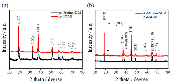 XRD patterns of the (a) precursors and (b) cathode active materials of pristine NCM and NCMS.
