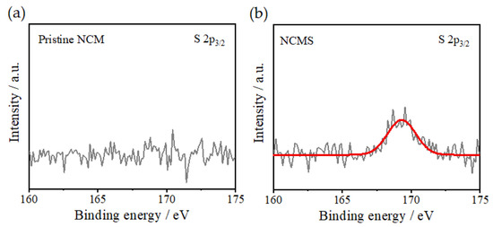 Figure 5a shows that all diffraction peaks are well consistent with β-Ni(OH)2 with no impurity phase [26]. There is no distinct difference between pristine NCM and NCMS in the precursors. Figure 5b reveals that both pristine NCM and NCMS have the well-layered structure of α-NaFeO2 type with the space group R-3m [27,28]. However, an Li2SO4 impurity phase around 22° peak is observed in NCMS. This result indicates that some sulfate impurities are still present in the precursors after filtering and washing, and these sulfate impurities appear in the cathode active materials after calcination and could lead to poor performance in a charge-discharge test. These weak peaks related to Li2SO4 phase are also proven by the presence of sulfur in the following XPS analysis (Figure 6). Figure 6b exhibits a binding energy of 169.2 eV, which is assigned to hexavalent S 2p3/2 of the SO42− groups [29]. This result identifies the presence of sulfate groups on the surface of NCMS.