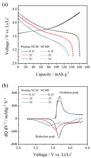 (a) Charge and discharge capacities and (b) dQ/dV plots of pristine NCM and NCMS at 0.1, 2, and 5 C.