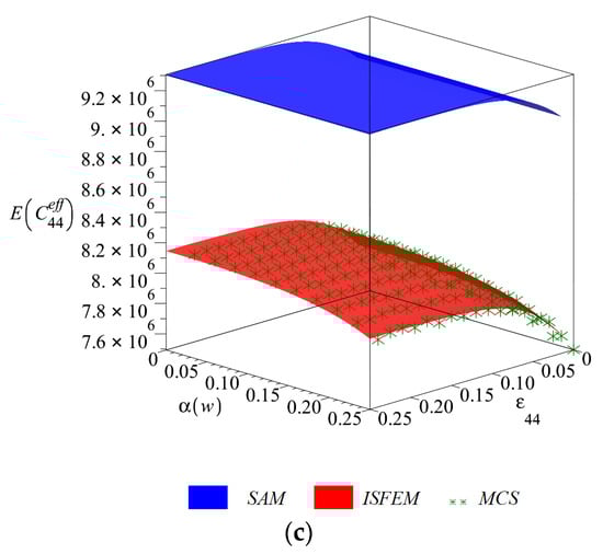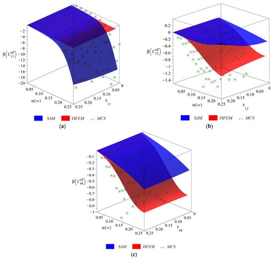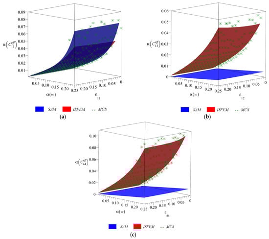 . The characteristics of the uniaxial coefficient are exclusively shown in part (a), the biaxial ones in part (b) and shearing ones in part (c) of these graphs. Colors on these graphs distinguish the three independent probabilistic methods applied, i.e., the iterative stochastic finite element method (ISFEM, red color), the Monte Carlo simulation (MCS, green color) and the semi-analytical method (SAM, blue color) that were used in the computations. The ISFEM and SAM produce continuous results in the entire domain of