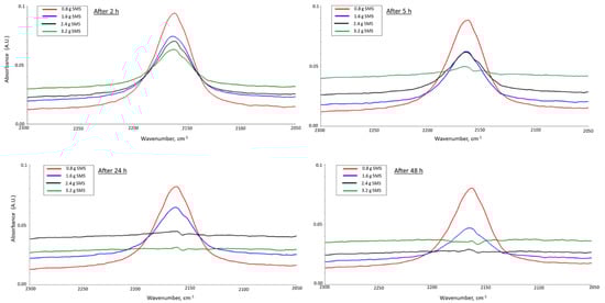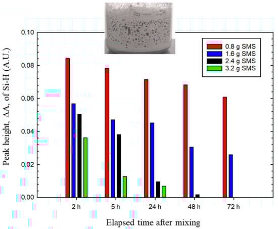 To establish the treatment procedure of FCS with PMHS in the presence of SMS, firstly, the appropriate concentration of the SMS and the treatment time were determined. Different amounts of SMS (0.8, 1.6, 2.4, and 3.2 g) were dissolved in 15 g of water. To each of the SMS solutions, 1.2 g of PMHS was added and mixed for 30 min with a magnetic stirrer. Thereafter, 16 g of FCS was incorporated into the PMHS/SMS blend and mixed by hand for 30 s to prepare paste-like samples. In the following two days, the blends were hand-mixed 4 times a day with a 2 h interval. The extent of the dehydrogenation reaction of Si–H functional groups within PMHS with the OH groups on the FCS surfaces was monitored by Attenuated Total Reflectance-Fourier Transform Infrared Spectroscopy (ATR-FTIR). There are two IR absorption bands for Si-H bond [,,]: one is stretching vibration (νSi–H) at ≈2160 cm−1; the other is bending vibration (δSi–H) at 828 cm−1. We monitored the decrease in the peak height, ∆A, of the band at 2163 cm−1 as a function of SMS amount as well as the elapsed reaction time between two hours after the sample preparation and up to 3 days. The decreased ∆A value can be accounted for by reacting Si–H groups with OH groups and NaOH. Figure 2 depicts the changes in spectral features for the different amounts of SMS after the elapsed times of 2, 5, 24, and 48 h. Correspondingly, Figure 3 shows the summarized results of ∆A values as a function of time elapsed after sample mixing. For all samples, ∆A decreased as the reaction time increased. The rate of ∆A decrease depended primarily on the SMS content. As expected, higher SMS concentrations accelerated the dehydrogenation reaction of Si–H. The reaction was accompanied by the release of H2, which resulted in the blend foaming (see the photograph in Figure 3).