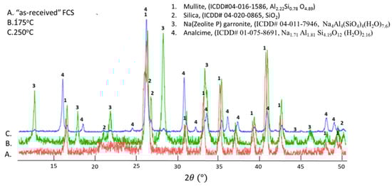 XRD patterns of “as-received” FCS, 175°- and 250°-autoclaved FCS/SMS blends.
