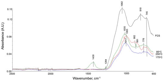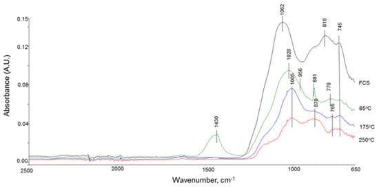 ATR-FTIR spectra of “as-received” FCS and FCS/SMS samples made at hydrothermal temperatures of 85, 175, and 250 °C.