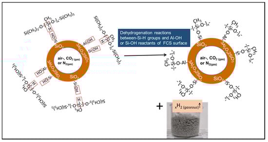 We also evaluated FCS surface hydroxylation with the formation of silanol and aluminol groups at room temperature. The FCS/SMS slurry was left for 24 h at room temperature and then dried for 3 days in a vacuum oven at 60 °C. Although not shown in the figure, the spectrum included silanol- and aluminol-related shoulder bands at 935 cm−1 coexisting with O–H stretching vibration (νs O–H) in Si- and Al–OH at 3421 cm−1. Thus, these functional hydroxyl groups formed on FCS surfaces at room temperature. Importantly, the formation of Si–OH and Al–OH groups on FCS surfaces in the presence of SMS accelerated the dehydrogenation reactions between Si–H in PMHS and OH–M (M: Si or Al) in FCS at 85 °C, Si–OH + OH–M–FCS → Si–O–M–FCS + H2↑ (Figure 6).