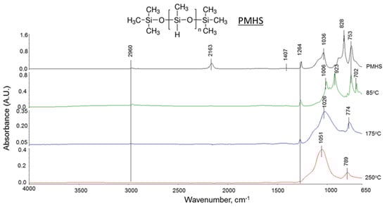 ATR-FTIR spectra of “as-received” PMHS, and PMHS/SMS samples cured at 85, 175, and 250 °C.