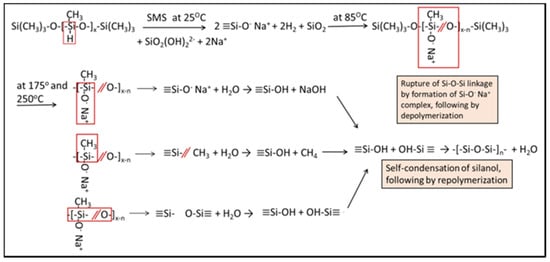 Regarding the thermal stability of PMHS, thermogravimetric study showed that the continuous weight loss of this chemical occurred at temperatures, ranging from 160 to 340 °C. At over 340 °C, a considerable loss of weight was due to thermal decomposition of backbone Si–O–Si linkages [,]. Thus, PMHS appears to possess a good thermal stability, but there is no information available for its hydrothermal stability in alkali environments at elevated temperatures.