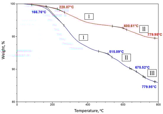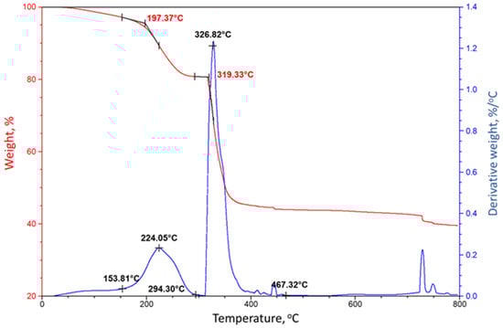 The thermal stability of siloxane at 85 °C and RIP formed by repolymerization at 250 °C was evaluated using thermogravimetric analyzer. Firstly, the thermal stability of “as-received” PMHS was determined (Figure 9). The TGA curve showed two thermal degradation regions: one starting at ≈197 °C and the second one starting at ≈319 °C. The analysis of the differential thermal gravimetric (DTG) curve showed that the first degradation occurred between about 154 and 224 °C. Since the boiling temperature of PMHS is ≈205 °C, this weight loss was due to the volatilization of an organic CH3 group in the Si–CH3 bond, corresponding to the weight loss of ≈14%. The second region of the major weight loss of ≈36% occurred between ≈319 and 467 °C and was related to the depolymerization of PMHS through Si–O bond scission in Si–O–Si linkages [,,].