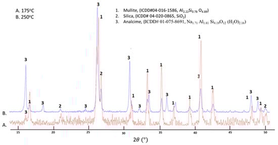This study was done to evaluate the effectiveness of deprotonated PMS to prevent pozzolanic reactions of FCS in the presence of SMS through the formation of the interfacial chemical bond: Si–O–M–FCS (M: Si or Al). Figure 11 provides the XRD patterns and crystalline phases identified from these patterns for samples cured at 175° and 250 °C. At 175 °C, many unreacted FCS were present, as is evident from the strong peak intensities of mullite and silica, while the weak analcime-related peaks demonstrated that the presence of analcime as the reaction product between FCS and SMS was small, if any. Interestingly, there was no garronite (or Na(zeolite P)) phase that was formed in the FCS/SMS system at the same temperature. Since zeolites are reaction products of FCS pozzolanic reactions, this finding strongly verified that the PMHS/FCS interfacial bond was strong enough to impede pozzolanic reactions of FCS with SMS, providing FCS chemical inertness to these reactions at 175 °C. However, temperature increase to 250 °C engendered the loss of the chemical inertness. The peak intensity of analcime increased significantly, while the intensity of mullite and silica peaks decreased at 250 °C, suggesting the breakage of the interfacial chemical bond, ≡Si–O–//–M–FCS, at 250 °C.