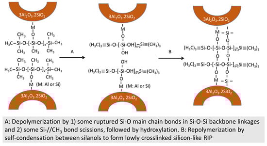 There are two other signs of such repolymerization. As is evident from the spectrum at 175 °C, there was no band at 923 cm−1 related to the Si–O− Na+ complex, while the peak intensity of Si–CH3-associated bands at 1264 cm−1 and 753 cm−1 slightly decreased compared with that at 85 °C. In fact, the ∆A values at the 2163 cm−1 band at 85° and 175 °C were 0.017 and 0.014, respectively. These data suggest that the Si–O− Na+ complex underwent hydrolytic attacks in the hydrothermal environment at 175 °C, inducing the formation of a silanol (Si–OH) group as the hydrolysate, Si–O− Na+ + H2O → Si–OH + NaOH. The decreased intensity of Si-CH3 bands may be a result of the hydrolysis-led scission of Si–CH3 bond in an alkali hydrothermal environment at an elevated temperature at 175 °C []. This bond scission substitutes the debonded methyl (CH3) groups with hydroxyl (OH) groups, Si–/CH3 + H2O → SiOH + CH4(gaseous)↑ with the formation of silanol []. Furthermore, the study on the hydrothermal stability of crosslinked liquid silicone rubber after a long time exposure to 100 °C revealed the cleavage of the Si–O–Si backbone as the major degradation mechanism [], suggesting that the scission of Si–O–Si linkages results not only from alkaline degradation with the formation of the Si–O− Na+ complex, but also is likely to be related to the high hydrothermal temperature of 175 °C. Next, all newly formed silanol groups branching from Si–O chains react with each other to produce new Si–O–Si linkages in self-condensation, Si–OH + OH–Si → Si–O–Si + H2O []. The information above explains the repolymerization taking place at 175 °C. A further advance of repolymerization was observed for samples autoclaved at 250 °C. Among the major changes in the spectral feature of these samples compared to samples cured at 175 °C was a further shift of the Si–O–Si bond to higher wavelength at 1051 cm−1 from 1026 cm−1, an increase in peak height of the Si–O–Si bond band representing enhanced self-condensation, and very weak Si–CH3 bands, implying higher hydrolysis compared with that at 85° and 175 °C.