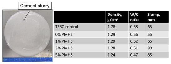 Figure 15 shows a photograph of cement slurry with (5% PMHS)-treated FCS and a table that compares the density and slump values of reference and lightweight cement slurries made with W/C ratios (where C is the total CAC and FCS weight), ranging from 0.47 to 0.58. The water was added to the slurry until water bleeding was observed (appearance of water at the surface). The reference cement slurry of TSRC had the density of around 1.78 g/cm3 at 0.58 W/C ratio, and 65 mm slump. The density of the lightweight slurry with non-treated FCS (0% PMHS) was 29% lower, 1.29 g/cm3, with a W/C ratio of 0.56. The slump decreased from 65 to 55 mm for the lightweight slurry with non-treated PMHS, suggesting the decreased workability of the slurry. Treatment of FCS with PMHS resulted in increased slurry fluidity (increased slump) at lower W/C ratios. The slump was 80 and 85 cm for the PMHS treatment of 3 and 5%, respectively. The changes in the slurry properties for PMHS-treated FCS are probably due to the lubricant effect of silicon–oil-based PMHS. The W/C ratio decreased from 0.56 for non-treated FCS to 0.47 for FCS treated with 5% PMHS. Thus, the lubricating effect of PMHS allowed good slurry flow with decreased water content. The densities of the slurries with PMHS-treated FCS varied between 1.24 and 1.29 g/cm3.