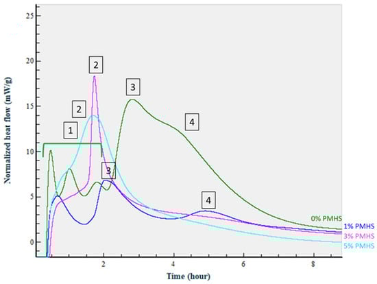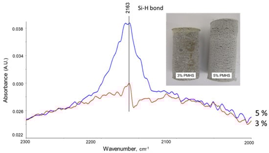 If non-reacted PMHS remains in the cement slurry, it may interact with CAC. Samples prepared with FCS treated with 5% PMHS underwent nearly 19% volumetric expansion after 24 h at room temperature, while those with FCS treated with 3% PMHS did not change in size (Figure 16). It is reasonable to assume that the expansion was caused by the reactions of Si–H groups that remained non-reacted after the pre-treatment of FCS. To analyze the PMHS that remains non-reacted during the treatment of FCS, the blend of FCS/SMS was treated with 3 and 5% PMHS and left for 72 h at ambient temperature; then, the Si-H related absorbance peak 2163 cm−1 was compared for the two PMHS concentrations (Figure 16). The peak was clearly much higher for the blend with 5% PMHS, confirming the presence of non-reacted Si–H groups at high PMHS concentration.