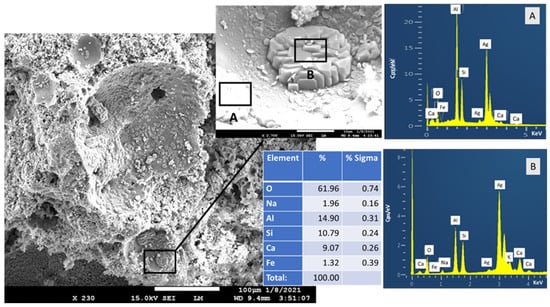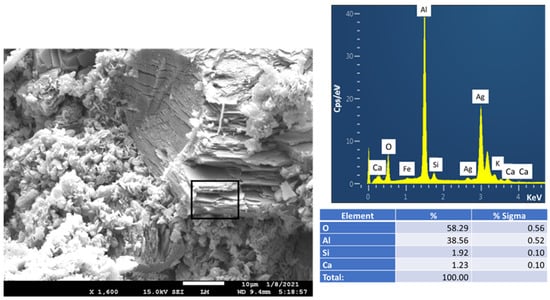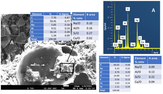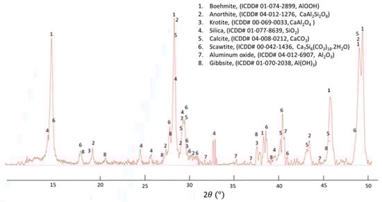 The XRD pattern (Figure 17) revealed multiple crystalline reaction products including boehmite, AlOOH, anorthite, CaAl2Si2O8, calcite, CaCO3, scawtite, Ca7Si6(CO3)O18·2H2O, and gibbsite, Al(OH)3, coexisting with unreacted starting materials, krotite, CaAl2O4, and aluminum oxide, Al2O3, in CAC, as well as silica, SiO2, from SMS. The quantitative data suggested that among the major phases were boehmite (23%), anorthite (19%), and scawtite (14%). Both anorthite and scawtite came from hydrothermal reactions of CAC with silica derived from SMS. (Note that the high-temperature crystalline products of CAC hydration include katoite and boehmite, and the XRD patterns of the hydrated cement can be found in [].)