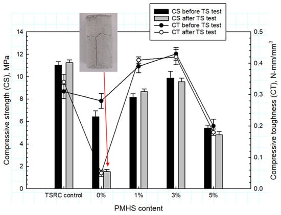 Hence, the above information strongly suggested that if FCS shell surfaces can be functionalized with –OH groups, PMHS is applicable as pozzolanic reaction-inhibiting surface treatment additive. A SMS alkali activator, which is a part of the TSRC formulation, may be used to incorporate –OH groups into the surface of FCS shell. In fact, the pozzolanic reactions of zeolite, silica, and clay minerals in alkali environments were shown to create Al(OH)4- and SiO(OH)3-anionic reactants on the mineral surfaces [,,,].