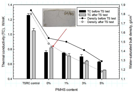 The free water content was determined in the following manner. Before TS tests, the excess water was wiped of the surface of autoclaved samples with a paper towel. Then, the samples were placed in a vacuum oven for 3 days at 60 °C to eliminate removable free water. The free water content, wt.%, was computed by (Wwet − Wdry)/Wwet × 100, where Wwet is the weight of a wiped water-saturated sample after the autoclave and Wdry is the weight of the dried sample. After the TS tests, the samples were immersed in water at ambient temperature for at least 4 days until the weight of the samples became constant. Afterward, the free water was calculated in the same manner as that of the samples before the TS.
