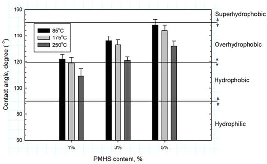 To avoid FCS degradation in high-temperature alkaline environments, their surfaces may be treated with pozzolanic reactions-inhibiting agents. Polymethylhydrosiloxane (PMHS) can be a suitable surface-treating chemical against the pozzolanic reactions of FCS. As already documented [,,,], PMHS is a hydrophobic, reducing agent that has siloxane backbone chains, (–Si–O–Si-O–)n, with two types of functional groups: proton-donor Si–H and hydrophobic Si–CH3, representing the –[–Si(CH3)2–O–]m-[–HSi(CH3)–O–]n– structure. The functional Si–H reacts with hydroxyl (–OH) groups on any organic and inorganic substrates. Hydrogen is released during this interaction in the following dehydrogenation reaction: 2Si–H + 2OH-linked substrates → 2Si–O-substates + 2H2 (gas)↑. Then, oxygen bridges form between functional proton-depleted polymethylsiloxane (PMS) and substrates, resulting in the substrate surface coverage with hydrophobic –Si(CH3) groups attached to PMS chains. The surface of the substrate becomes water-repellent and hydrophobic. Most importantly, hydrophobic cement concrete provides good thermal insulating properties [].