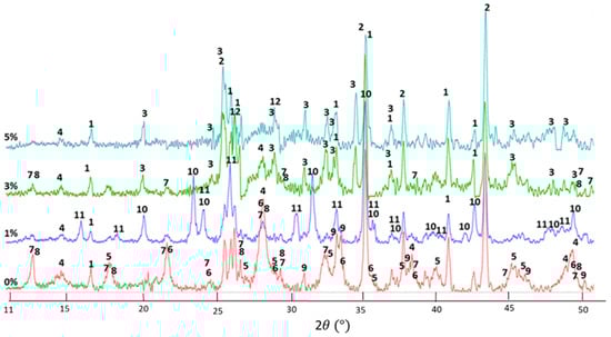 To determine the compressive strength, Young’s modulus, and compressive toughness, the composite samples were prepared in the following sequence. The hand-mixed slurries were poured in cylindrical molds (20 mm diam. and 40 mm height) and left to harden for 1 day at room temperature; thereafter, the hardened cements were removed from the molds and placed in a 99 ± 1% relative humidity (R.H.) for 1 day at 85 °C; finally, the samples were autoclaved in non-stirred Parr Reactor 4622 (Hillsboro, OR, USA) for 1 day at 175° and 250 °C. An Electromechanical Instorn System Model 5967 (Norwood, MA, USA) was used to obtain all mechanical properties. The ultimate compressive strength and Young’s modulus were determined for unconfined samples. The compressive toughness was computed from the area under the compressive stress–strain curve.