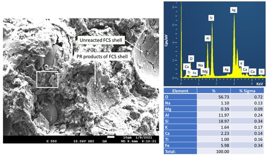 One important concern of using FCS as part of cementitious systems is the pozzolanic reactivity of their shells in alkaline environments containing OH−, Na+, Ca2+, and Al3+ ions. Pozzolanic reactions of the FCS’s shell can cause the volumetric expansion-induced failure of cements. Although such reactivity at low temperatures of 28–30 °C was minimal for OPC/FCS blends, an elevated temperature of 80 °C led to the acceleration of pozzolanic reactions with alkalis liberated from OPC to form aluminum-substituted tobermorite [Ca5Si5Al(OH)O175H2O] identified as the main reaction product []. Likewise, in the alkali-activated TSRC system, the FCS shells may be susceptible to pozzolanic reactions with SMS used as an alkali activator of FAF. In solutions, SMS forms three types of ions, Na+, OH−, and metasilicate anion, SiO32−. The pozzolanic reactions of FCS shells with alkali ions, OH− and Na+, may promote shells’ degradation after a certain period of exposure in hydrothermal environment at high temperature ≥250 °C. If so, the degradation may cause undesirable consequences, including a loss of thermal insulating capability by increased water absorption along with a loss of gaseous phases from the FCS, and a reduction of the mechanical strength of the cement sheath due to pozzolanic reactions-induced swelling and expansion of cement matrix.