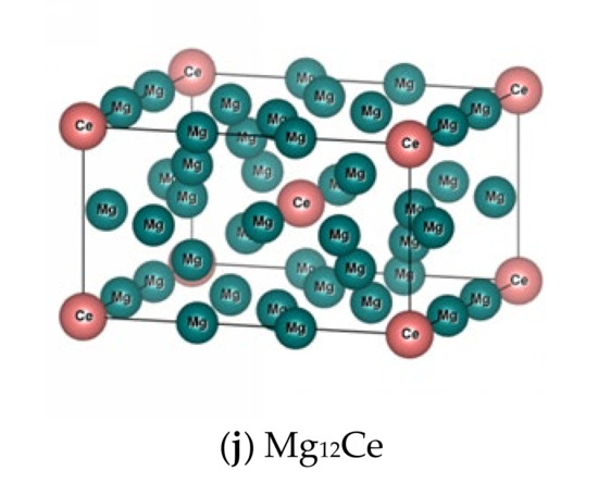 Cerium (Ce) is one of the RE elements with the highest contents [34], and whose atomic radius is close to that of Mg. The solid solubility of Ce in Mg was only 0.52% [35]. Therefore, the second phases formed by Ce were easily precipitated at the grain boundary, which hindered the slip of the grain boundary during deformation and effectively improved the mechanical properties and creep resistance of magnesium alloys. However, the addition of rare earth elements completely changed the alloying sequence of the matrix alloy, due to its unique physical, chemical, and electronegativity properties [36]. A large number of different types of second phases were formed as consequence [24]. Taking Mg-Ce and Al-Ce binary alloys as examples, the second phases found by experimental methods included MgCe [37], Mg2Ce [38], Mg3Ce [39], Mg12Ce [40], Mg17Ce2 [40], AlCe [41], Al2Ce [42], Al3Ce [43], Al4Ce [25], Al11Ce3 [44], etc. Although transmission electron microscopy (TEM), electron probe micro analyzer (EPMA), X-ray diffraction (XRD), differential scanning calorimetry (DCS), energy dispersive spectroscopy (EDS), and other techniques were used to analyze the structure and properties of these phases, the information on the formation sequence and thermodynamic stability of the phases was still limited. It should be noted that it took extensive work to verify the effect of these precipitations on magnesium alloys by experimental methods, one by one, not to mention that the β-phase precipitation sequence and the strengthening mechanism of Mg-Ce based ternary or multi-elements alloys were much more complicated.