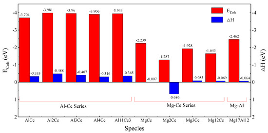 Figure 2. The contrast of ECoh and △H among Al-Ce, Mg-Ce, and Mg-Al phases.