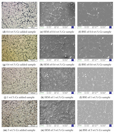 The metallographic and precipitated phase morphology of magnesium alloys with 0.2–3 wt.% Ce added are shown in Figure 4. The average grain size decreased slightly to about 300–400 μm, while the number of small-sized grains increased after adding 0.2–0.4 wt.% Ce element. However, when the addition of Ce was more than 0.6 wt.%, the grains grew gradually, as shown in Figure 4g,j,m. What was noteworthy was that the precipitate structure changed significantly after the addition of Ce element, with a small number of needle-like precipitates appearing in the grain and grain boundary and mixed with the conventional granular precipitates. In addition, the number of needle-like precipitates rose gradually when the Ce content increased, as shown in Figure 4b,e,h.