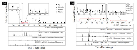 XRD was used to further analyze the compositions of the matrix alloy and samples with Ce element, and the results are shown in Figure 6. Clearly, the second phases in the matrix magnesium alloy were Mg17Al12, MgZn2, and trace Al8Mn5 (Figure 6a), which meant that the alloying reaction of the matrix alloy was mainly dominated by Al and Mg, and supplemented by the reaction of trace elements such as Zn, Mn, and Si.