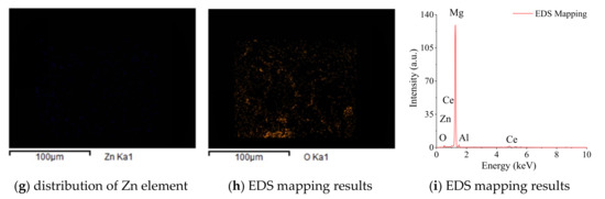 The back scattered electron (BSE) in Figure 4c,f,i,l and the EDS mapping observation in Figure 5 found several kinds of precipitates with obvious differences in shape and color contrast. It was clear that the Mn element appeared together with Al and Ce with a rod-like morphology, which was probably Al-Mn-Ce phase. The Zn element was accompanied by Al in the form of a granule shape (Al-Zn phase). While, needle-like phase with a length of about 50 μm was formed with Al and Ce elements (Al-Ce phase).