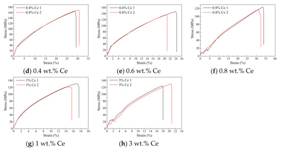Notably, the alloying reaction between Ce and the other alloying elements of the matrix reduced the number of nucleation cores, on the one hand, while the quantity of the second phases formed by other alloying elements was sharply decreased, on the other hand (such as Mg-Al, Al-Zn, Al -Mn, and Mg-Zn phases). However, the intermediate phases precipitated at the grain boundary could hinder the growth of crystal grains effectively, and also hindered the slip of the grain boundary when deformed. Therefore, after adding an excessive amount of Ce, the grain size of the magnesium alloy increased, and the mechanical properties of the alloy could be reduced, as shown in Figure 4d,g,j,m.