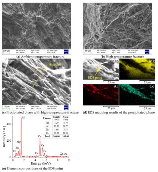 A magnified observation of the fracture found a needle-like second phase distributed at the bottom of the tear ridge, which was not fused with the matrix metal and penetrated the fracture with a broken shape. The EDS results showed that the phase was mainly composed of Al and Ce elements, with an atomic ratio of about 3:1 (Figure 12e), which suggests Al11Ce3 phase. The results above indicated that the high-temperature stable Al11Ce3 phase could hinder the activation of the Mg grain slip system during the high temperature deformation process, and the deformation resistance caused the fracture of Al11Ce3. However, the needle-shaped Al11Ce3 was prone to stress concentration and cracks, since the Al11Ce3 phase was not fused with the matrix alloy. Therefore, tensile fractures appeared at the interface of the Al11Ce3 and the matrix metal, which suggested that more Al11Ce3 was not always beneficial.