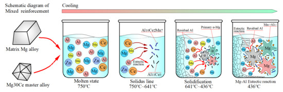 Based on the above theoretical analysis results, and combined with the Al-Ce and Mg-Al binary phase diagrams, and Al-Mn-Ce ternary phase diagrams, the strengthening mechanism of Ce element in the solidification process of Mg-Al alloys was deduced, which was divided into three stages, according to the temperature range, as shown in Figure 13.
