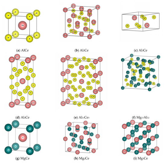 In a Mg-Al-Ce ternary alloy system, second phases can be one or more of the Mg-Al series, Mg-Ce series, or Al-Ce series. The crystal structures of the main second phases, according to the literature, are listed in Table 2; and the crystal models constructed with the structural information are shown in Figure 1. It was obvious that AlCe, Al2Ce, MgCe, Mg2Ce, Mg3Ce, and Mg17Al12 belonged to the cubic structure, which was a = b = c, α = β = γ = 90°; Al3Ce belonged to hexagonal structure, which was a = b ≠ c, α = β = 90°, γ = 120°; Al4Ce belonged to the square structure, with a = b ≠ c, α = β = γ = 90°; Al11Ce3 belonged to the orthogonal structure, with a ≠ b ≠ c, α = β = γ = 90°; and Mg12Ce belonged to a tetragonal structure, which was a = b ≠ c, α = β = γ = 90°. Among them, the spatial structures of AlCe and MgCe, and Al2Ce and Mg2Ce were exactly the same, except that the position of the Mg and Al atoms was exchanged.