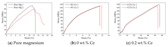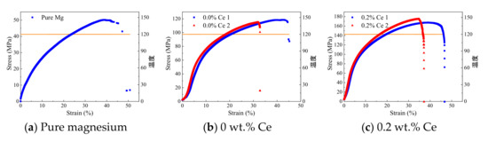 Tensile samples were sampled from the same position of the ingots with different Ce contents, and stretched at both ambient temperature and 120 °C; the tensile curves are shown in Figure 8 and Figure 9. The tensile strength (σb) of the as-cast pure magnesium was about 70 MPa, with an elongation (δ) of about 12% (obtained by the displacement of the chuck) at ambient temperature (Figure 8). As such, the mechanical properties of the pure magnesium were poor, and it would be difficult to meet the requirements of structural materials. However, the σb was improved to a level of 170 MPa after adding Al, Zn, Mn, and other alloying elements to the pure magnesium. However, the changes in δ were not that obvious, remaining at about 12%. When a further 0.2–0.4 wt.% Ce was added to the basis matrix magnesium alloy, the σb improved slightly to a 180 MPa level, but the δ increased remarkably to about 50%. Nevertheless, when the added amount of Ce exceeded 0.4 wt.%, the σb and δ both tended to decrease, which indicated that an appropriate amount of Ce was critical for the improvement of the plastic product strength.